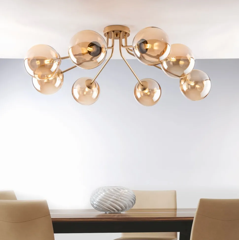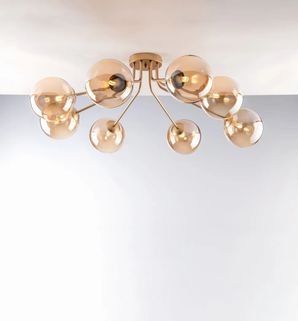 Freie Leuchtmittelwahl: Helligkeit und Lichtfarbe können mit der Wahl passender G9 Leuchtmittel individuell bestimmt werden | nicht im Lieferumfang enthalten Entdecke die perfekte Kombination aus modernem Design und funktionaler Eleganz mit unserer stilvollen Deckenlampe. Diese Deckenleuchte ist nicht nur ein Blickfang in jedem Raum, sondern sorgt auch für eine angenehme Lichtstimmung, die zum Verweilen einlädt. Ob im Wohnzimmer, Flur, Bad oder Arbeitszimmer – die vielseitige Deckenlampe passt sich harmonisch deinem Wohnstil an. Die Deckenlampe besticht durch ihre champagnerfarbenen Gläser, die ein warmes, weiches und blendarmes Licht erzeugen. So schaffst du eine gemütliche Atmosphäre, die sowohl für entspannte Abende als auch für produktive Arbeitsstunden ideal ist. Mit einem Durchmesser von 280 mm und einer Höhe von 880 mm fügt sich die Leuchte perfekt in deine Räume ein, während die festen Arme vom Baldachin eine stabile und ansprechende Aufhängung bieten. Dank der IP20 Schutzklasse ist die Deckenlampe für den Innenbereich geeignet und überzeugt durch ihre hochwertige Verarbeitung aus Metall und Glas. Du hast die Freiheit, das passende G9 Leuchtmittel bis 28W selbst auszuwählen, um die Lichtintensität nach deinen Wünschen zu gestalten. Diese Flexibilität macht die Lampe zu einer idealen Wahl für designbewusste Käufer, die Wert auf Qualität und Funktionalität legen. Fazit: Mit dieser Deckenlampe entscheidest du dich für ein modernes Lichtkonzept, das sowohl stilvoll als auch funktional ist. Lass dich von der Kombination aus elegantem Design und warmem Licht begeistern und verwandle dein Zuhause in eine Wohlfühloase.