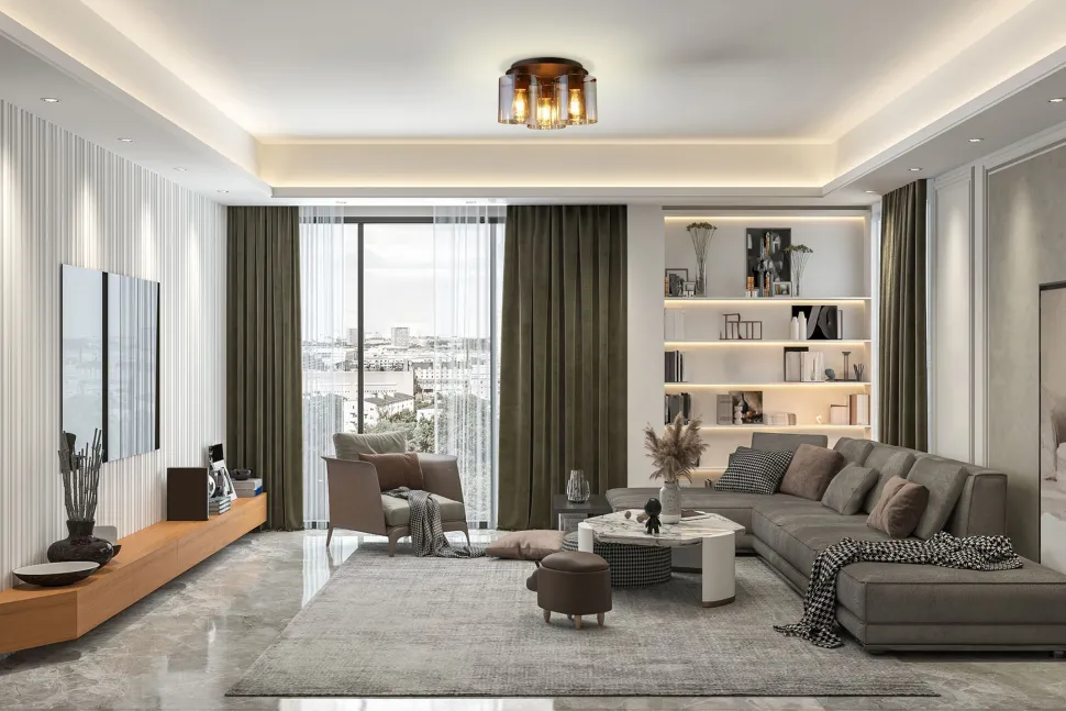Moderne Deckenlampe aus Metall und Glas in Mokka und Bernstein