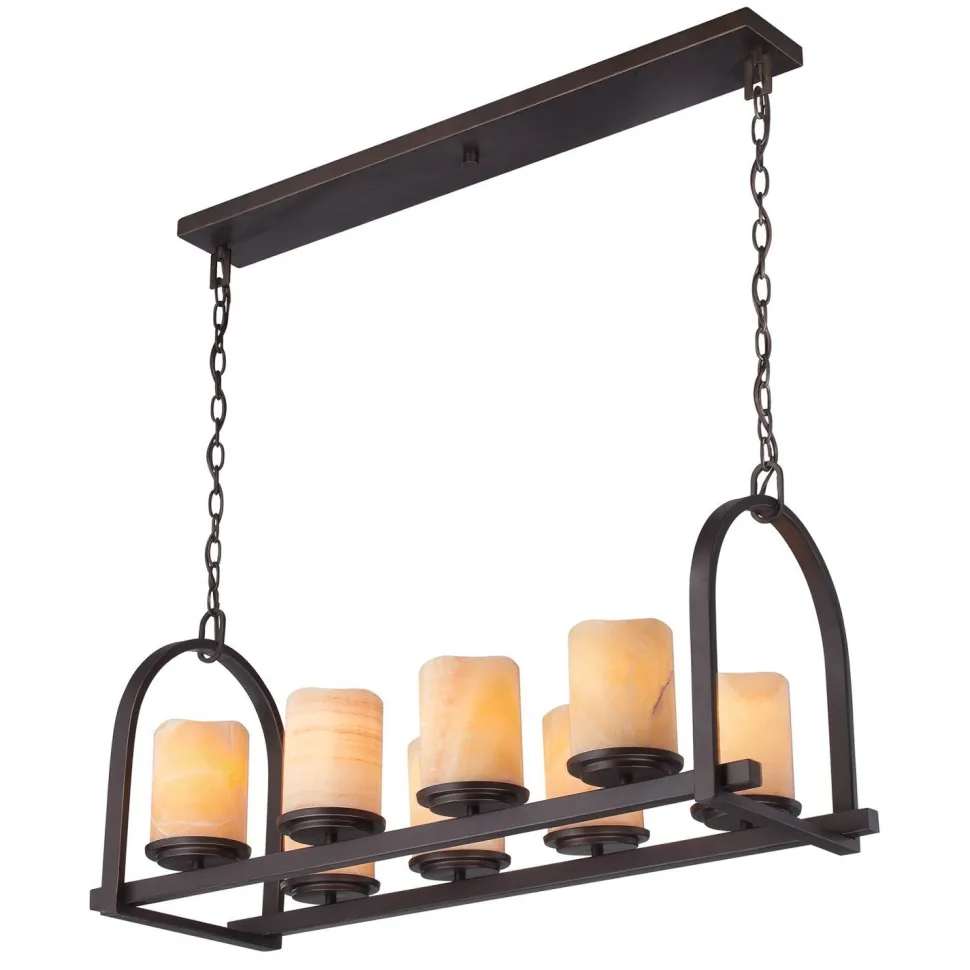 Der Lampenschirm im Stil einer Kerze besteht aus Onyx, dessen warmer Farbverlauf jede Hängeleuchte zu einem kleinen Unikat macht