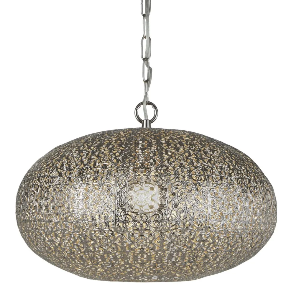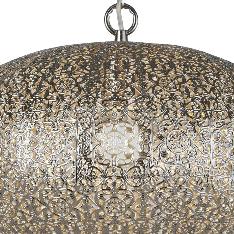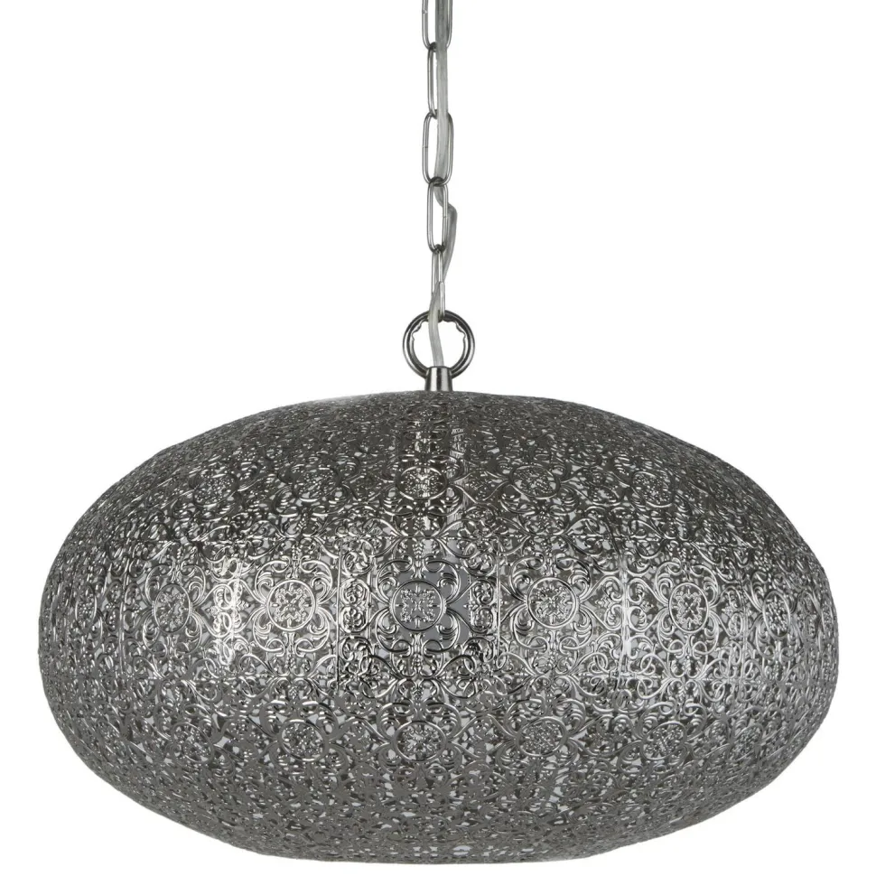 Der Metallschirm sorgt dank der Ornamente für ein besonderes Spiel aus Licht und Schatten, was durch klare Leuchtmittel weiter betont wird (nicht inkl.) – ein besonderer Blickfang in jedem Raum