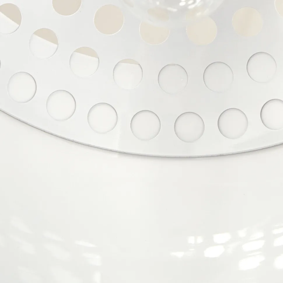 Der ausladende Schirm in Halbkugel-Form ermöglicht durch kleine Öffnungen an der Oberseite eine gleichmäßige Lichtstreuung