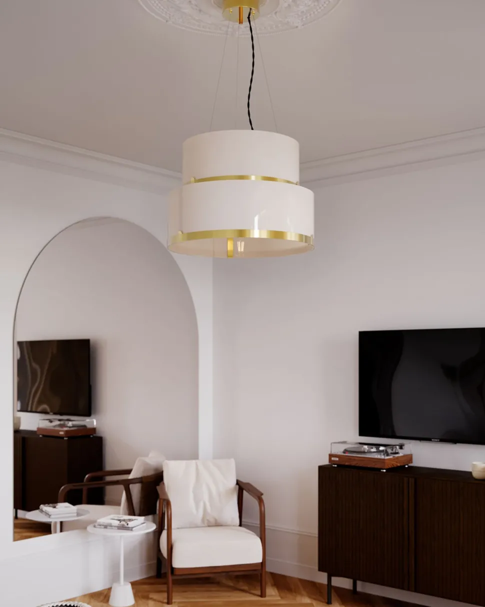 Zwei flache Zylinder aus Glas bilden den kunstvollen Lampenschirm, dessen edler Charakter sich ideal in eine moderne und wohnliche Einrichtung einfügt – ein besonderer Blickfang in jedem Raum