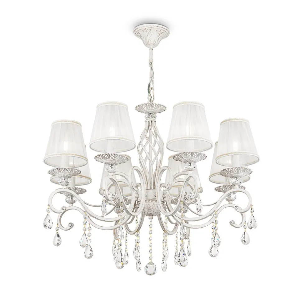 Die zarten Lampenschirme und die funkelnden Kristalle verleihen der Pendelleuchte einen romantischen Look – ein echter Hingucker in jedem Raum