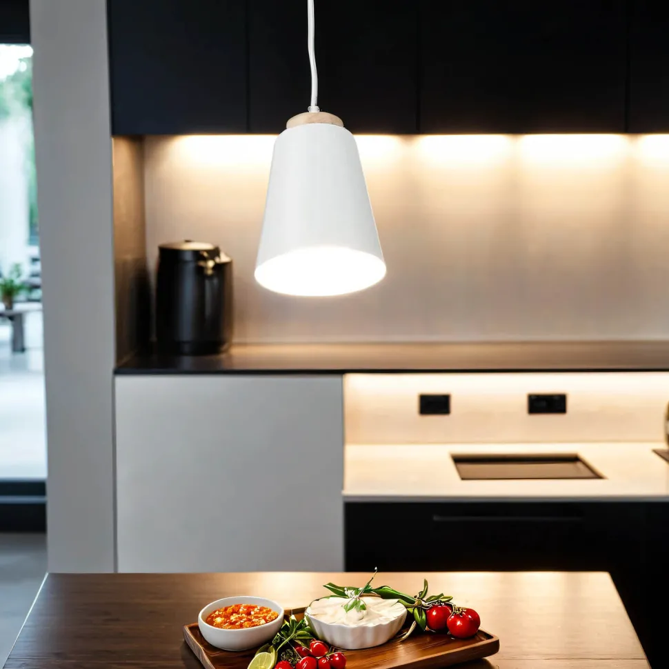 Dekorative Elemente aus Holz machen die kleine Hängeleuchte zu einem zeitlosen Klassiker für das Esszimmer, die Küche oder das Wohnzimmer