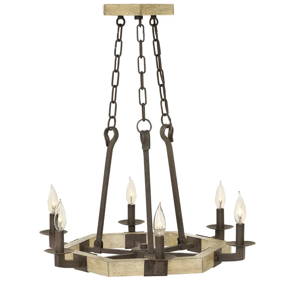 Der Materialmix von Eisen, Holz und Stoff bilden erinnert an den Wilden Westen und verleiht dem Lüster ein antikes Flair