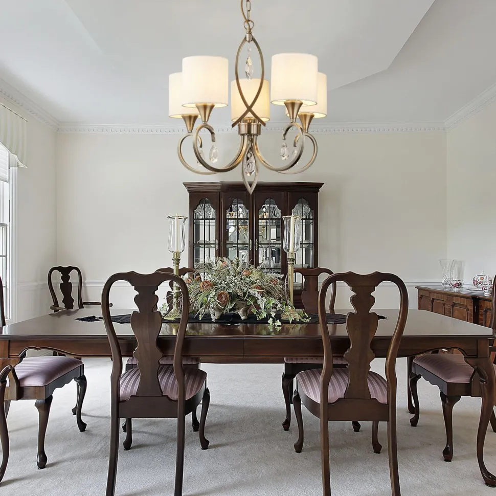 Das Licht wird durch die hellen Stoffschirme blendarm gestreut – perfekt für Wohnzimmer, Schlafzimmer und Esszimmer