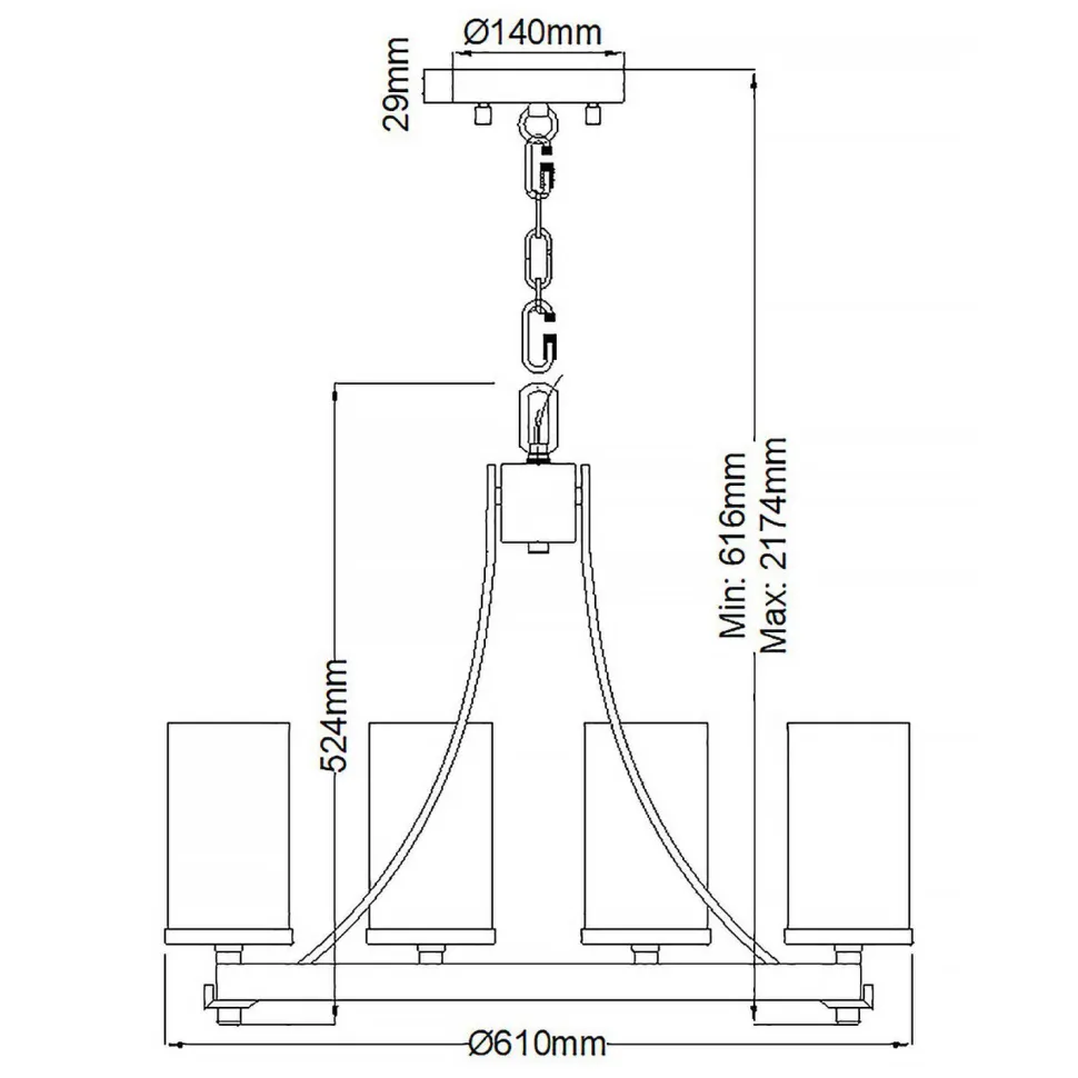 | Maße: | Breite: 610 mm | Hängetiefe: 616-2174 mm | Länge: 610 mm | Durchmesser: 610 mm | Höhe Schirm: 524 mm |