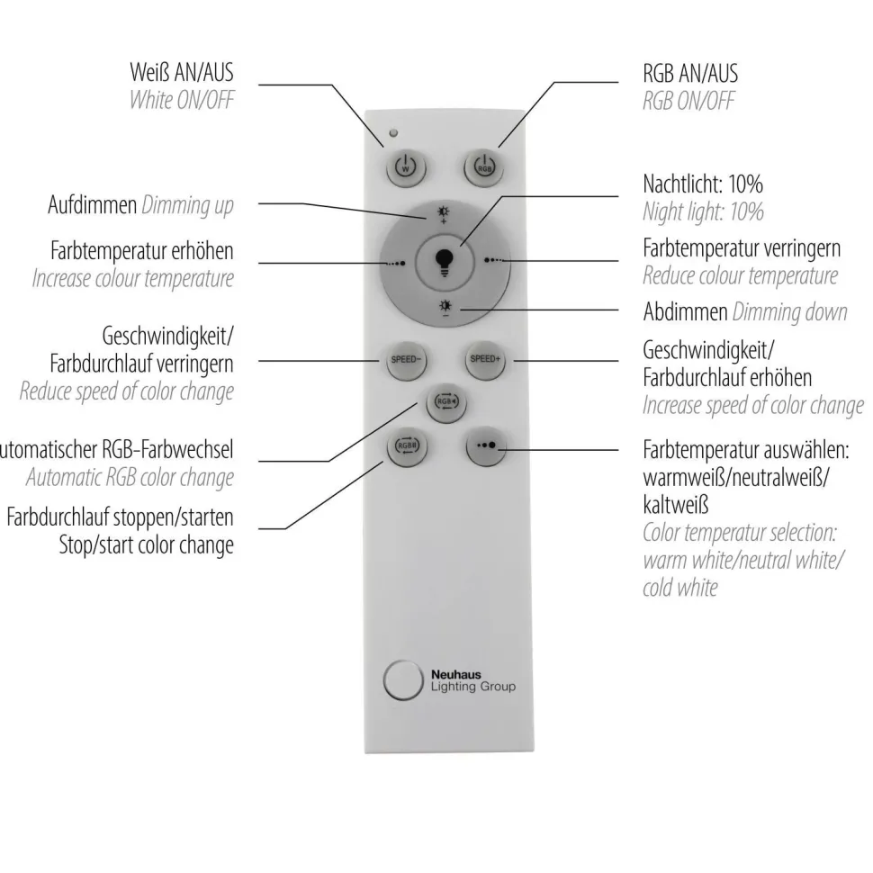Bedienung über mitgelieferte Fernbedienung (Dimmung und Farbtemperaturwechsel: 2700 – 5000 K)