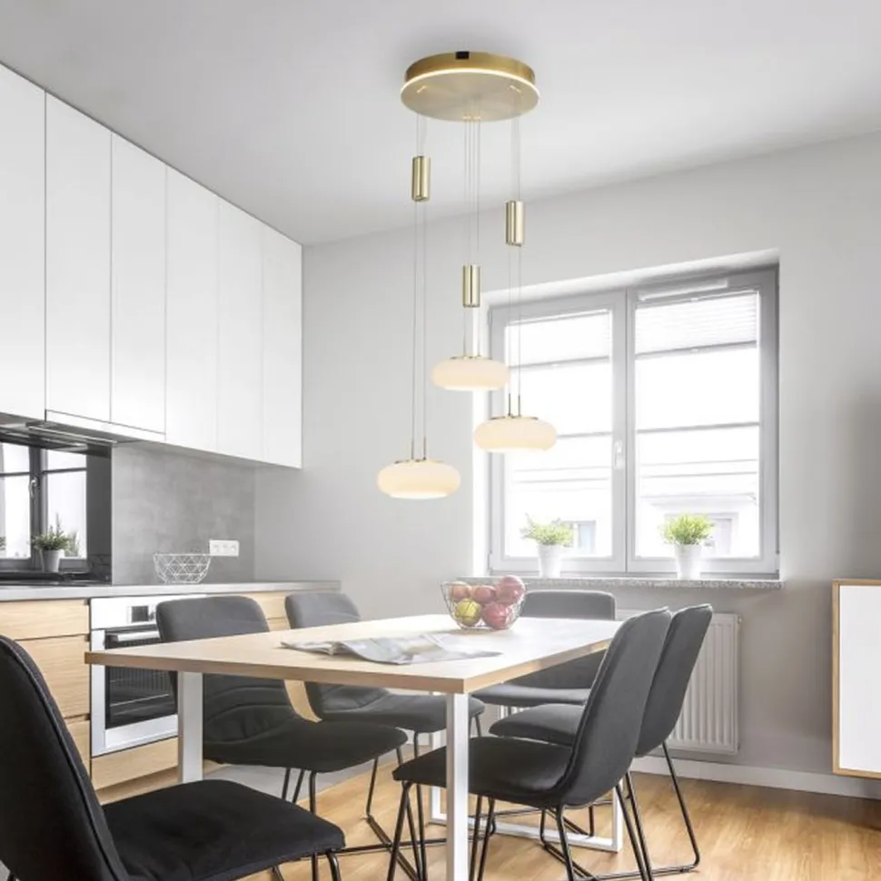 Moderne LED Pendelleuchte mit satinierten Glasschirmen in Messing