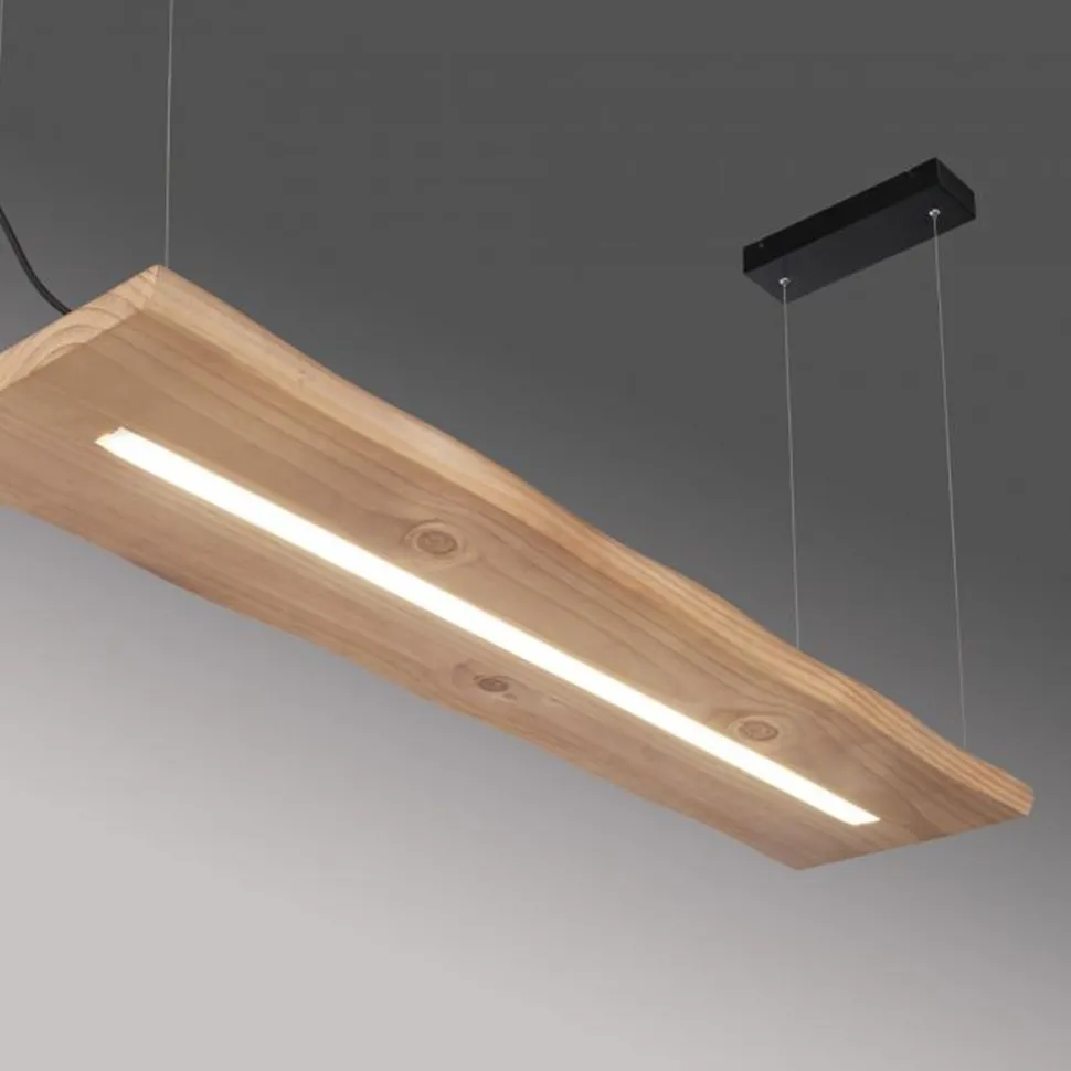Das große Holzelement sorgt für einen wohnlichen und natürlichen Akzent Zuhause – ideal als längliche Pendelleuchte über dem Esstisch in Wohnzimmer und Esszimmer