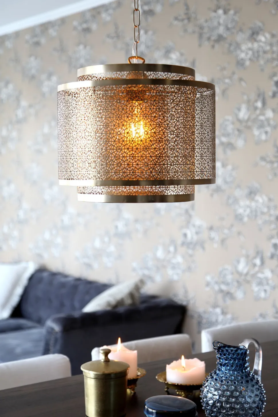 Elegante Pendelleuchte für Esszimmer und Wohnzimmer mit kunstvollem Doppelschirm aus Metall