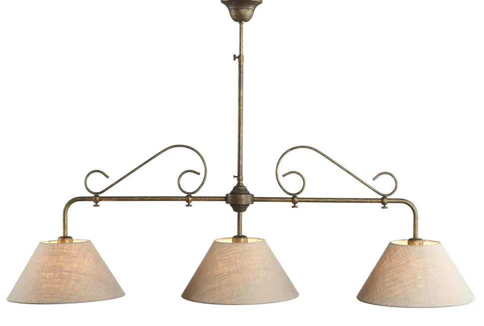 Rustikale Deckenlampe mit urig geschwungener Form und grob gewebten Stoffschirmen