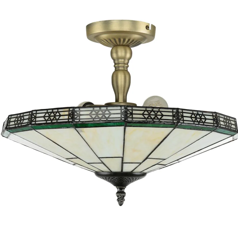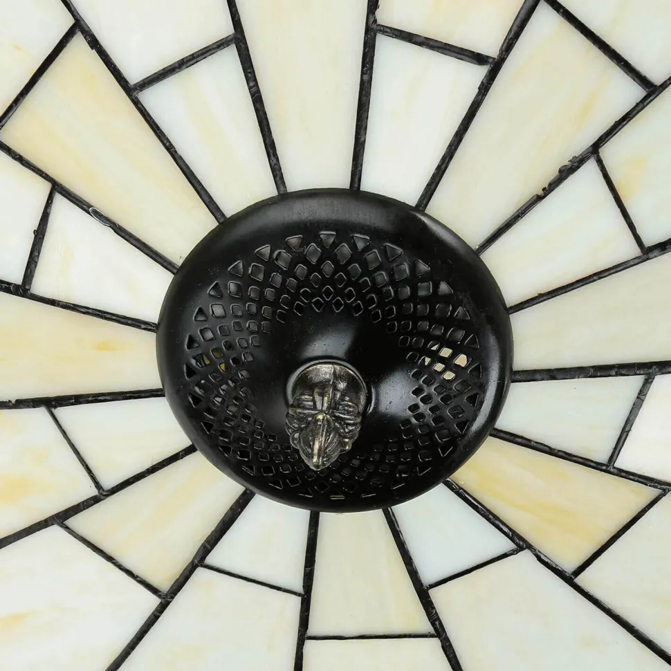 Der Lampenschirm besteht aus filigranen Glasstücken in Creme-Weiß und Grün, die zusammen ein klassisches Art Nouveau Muster ergeben