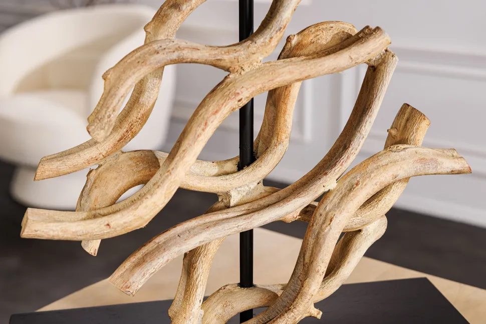 Moderne Tischlampe aus Teakholz und Stoff in Natur und Weiß