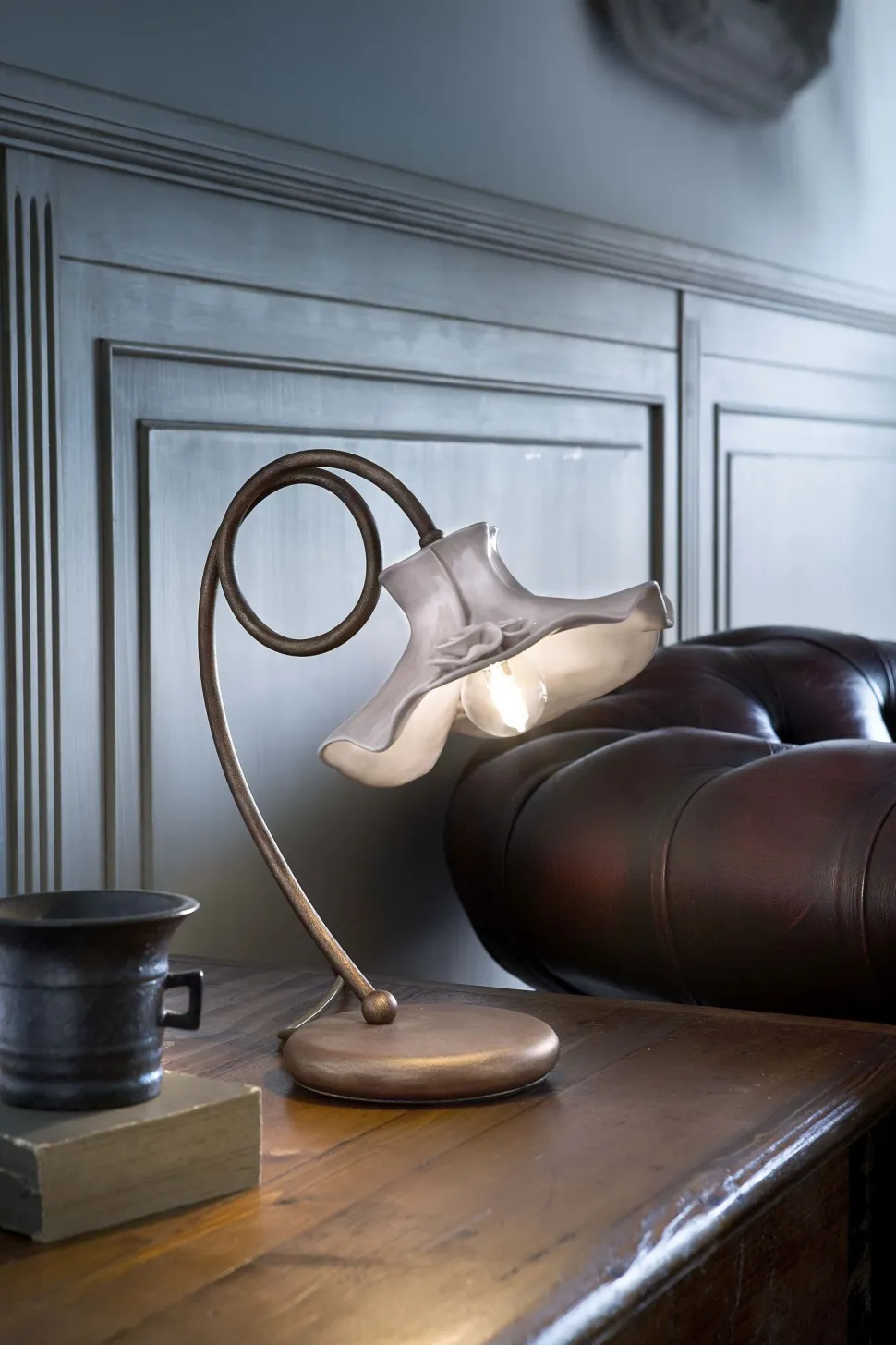 Der romantische Landhausstil wird durch eine dekorative Rosenblüte am Schirm ergänzt, was die Tischleuchte zu einem dekorativen Blickfang macht