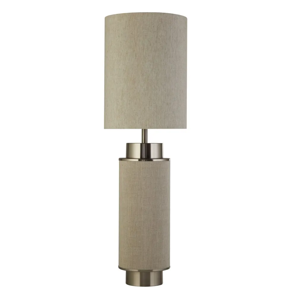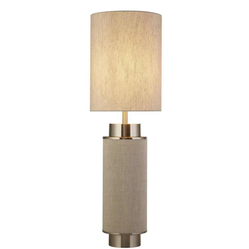 Das Grau-Braun in Kombination mit Akzenten in Nickel verleiht der Tischlampe einen edlen Look, der auch in Hotels und Restaurants für ein besonderes Ambiente sorgt