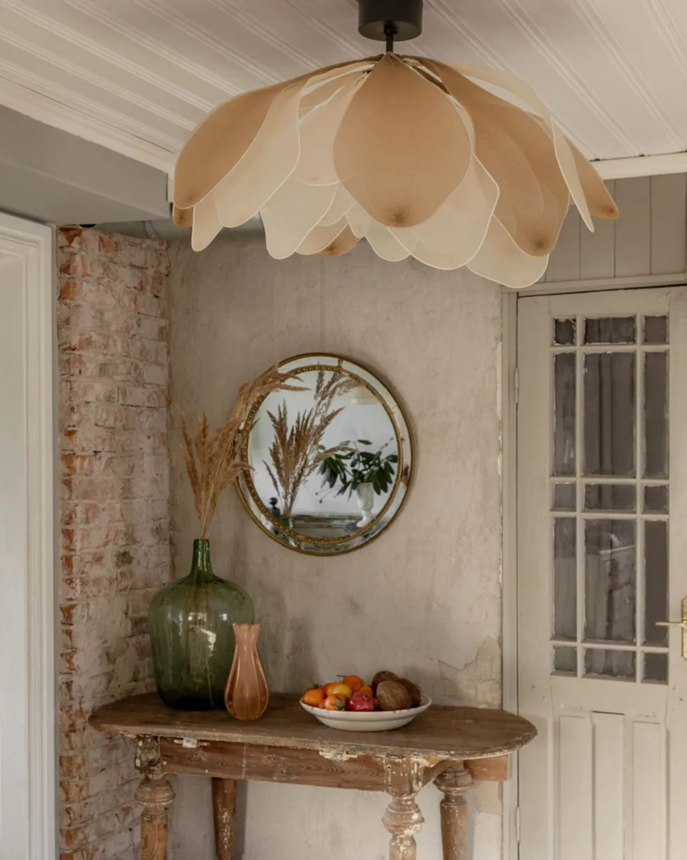 Die biegsamen Stoffblätter erwecken nicht nur den Eindruck einer Blüte in ihrer vollen Pracht, sondern sie erlauben auch eine individuelle Gestaltung der Deckenleuchte – ein einzigartiger Blickfang für Schlafzimmer, Wohnzimmer und Esszimmer