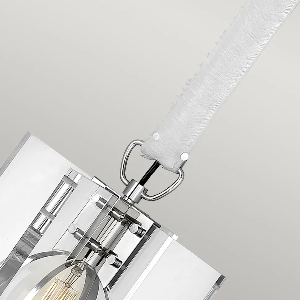 Der eckige Rahmen in spiegelndem Nickel setzt einen spannenden Kontrast zur runden Licht-Öffnung, was aus der Hängelampe einen dekorativen Blickfang in Wohnzimmer und Flur macht