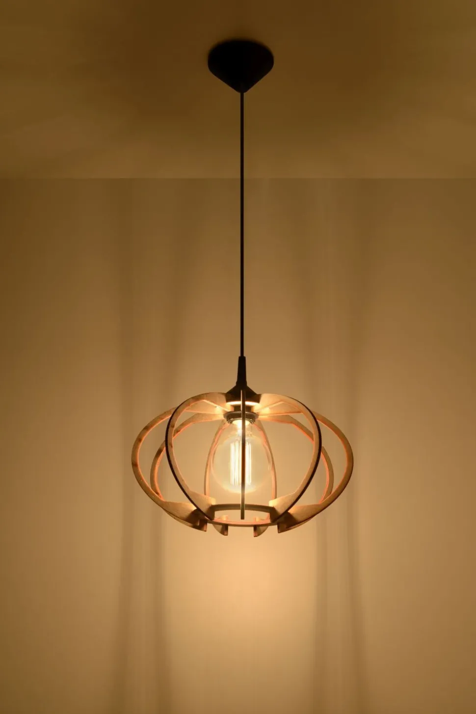 Der Lampenschirm aus Holz ist in einem wohnlichen Farbton gehalten und fügt sich ideal in jede Einrichtung ein