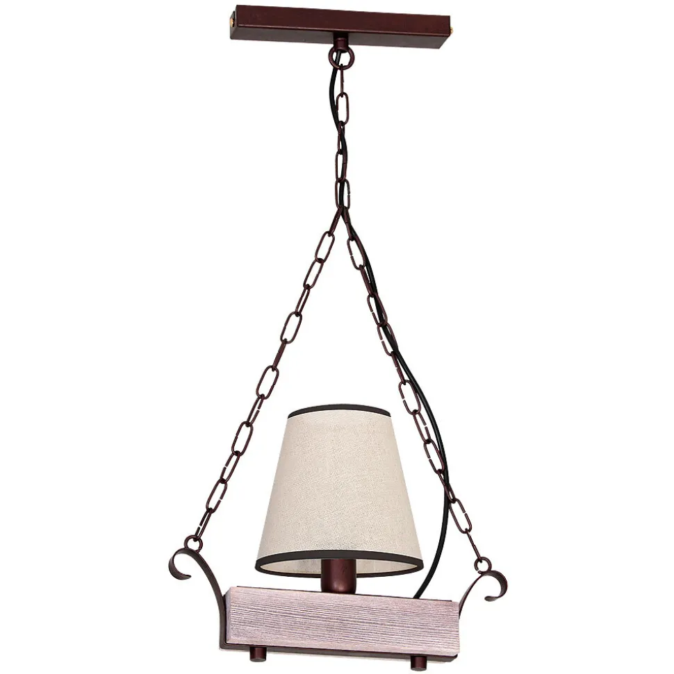 Pendellampe im Landhaus Design, außergewöhnlicher Farb- und Materialmix: dunkles Metall, helles Holz, beigefarbener Stoffschirm – setzen Sie Akzente!