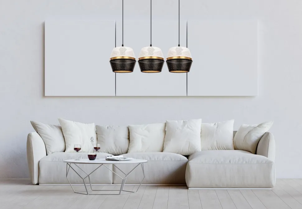 Qualität Made in EU Entdecke die Loft Pendelleuchte PATBOND – ein Meisterwerk aus Metall, das deinem Zuhause einen Hauch von Eleganz verleiht. Mit einer beeindruckenden Länge von 900 mm und einer Höhe von 700 mm ist diese mehrflammige Pendelleuchte nicht nur ein Blickfang, sondern auch ideal für hohe Decken. Die Kombination aus Schwarz, Weiß und Gold sorgt für ein stilvolles Ambiente, das sowohl in deinem Wohnzimmer als auch in der Küche oder im Esszimmer perfekt zur Geltung kommt. Die PATBOND Pendelleuchte überzeugt durch ihr einzigartiges Design: Die winzigen Löcher in den Metallschirmen schaffen ein faszinierendes Lichterlebnis, das jeden Raum in einladendes Licht taucht. Mit einer Hängetiefe, die sich perfekt an deine Bedürfnisse anpasst, wird diese Hängelampe zum Highlight über deinem Esstisch oder in deinem Wohnzimmer. Dank der IP20–Schutzklasse ist sie für den Innengebrauch geeignet und lässt sich problemlos mit 3x E27 Leuchtmitteln bis 60W betreiben. Die Qualität „Made in EU“ garantiert dir nicht nur Langlebigkeit, sondern auch ein durchdachtes Design, das sowohl funktional als auch ästhetisch überzeugt. Egal, ob du eine stilvolle Küchenlampe oder eine moderne Esstischlampe suchst – die PATBOND Pendelleuchte erfüllt all deine Ansprüche. Setze auf die perfekte Kombination aus Funktionalität und Design und bringe mit dieser Pendelleuchte Gold und Eleganz in dein Zuhause. Lass dich von der PATBOND inspirieren und genieße die harmonische Lichtstimmung, die sie verbreitet.