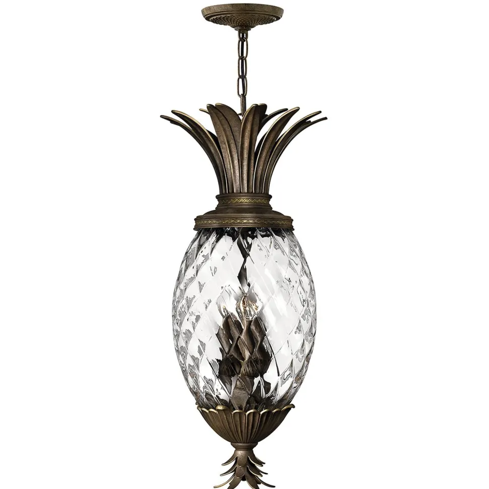 Eine Ananas aus geschliffenem Glas dient als Lampenschirm macht aus der Pendelleuchte ein dekoratives Meisterwerk