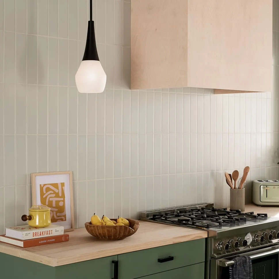 Die bauchige Pendelleuchte sorgt für eine blendarme Lichtstreuung und fügt sich ideal in Küche, Esszimmer und Wohnzimmer ein