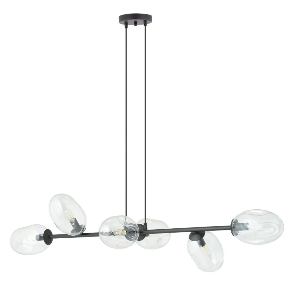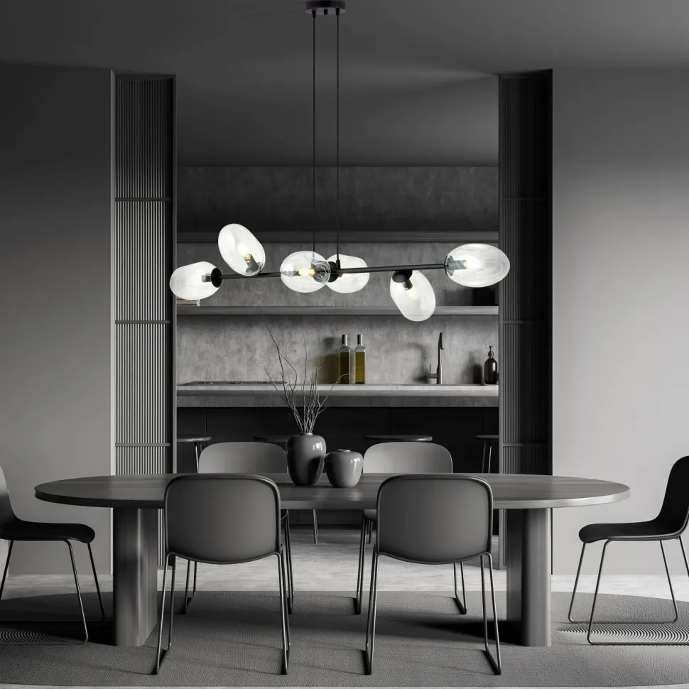 Die längliche Hängeleuchte sorgt für eine direkte Beleuchtung und passt ideal über den Esstisch