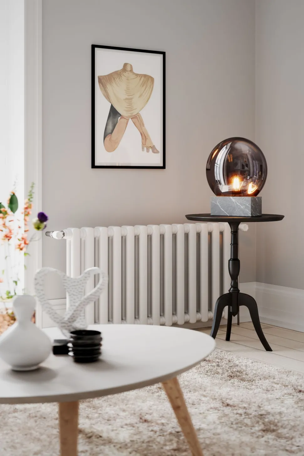 Der Kugelschirm aus Rauchglas sorgt für eine großzügige Lichtstreuung – ideal als Beistelllampe und Fensterlampe
